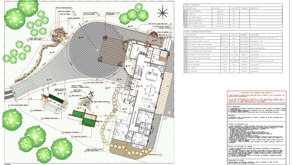 Planejamento de espaços de lazer e recreação nas áreas externas residenciais, com definição de platôs, taludes e desníveis para melhor aproveitamento do terreno.